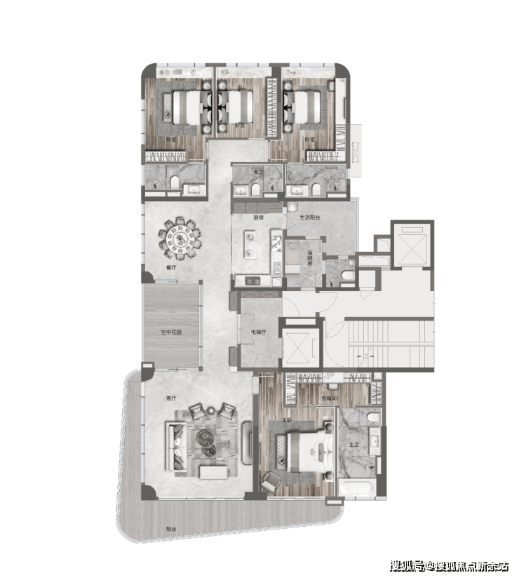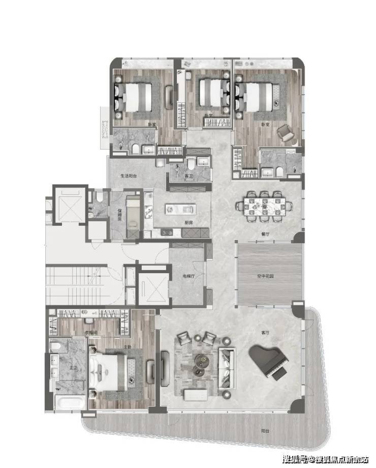 约75㎡阔绰方正的客厅,尽揽三江风光,约28米超长弧形阳台,媲美游轮的“甲板级阳台”,带来270°巨幕江景视野,拥揽无尽天际线。