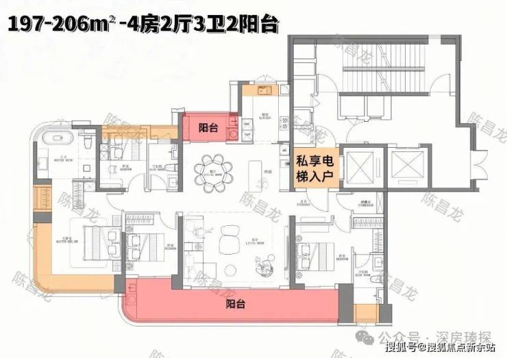 197-206m²的4房2厅3卫2阳台,设计的是竖厅格局,客厅6.1米开间,LDKB大方厅设计,2梯2户,尊享专梯专户,私享入户公区,进门配置储物间,五开间朝南,主卧270°无柱转角飘窗,双套房设计,中西双厨房,主卫配置浴缸,得房率约94.6%(包含赠送),不含电梯入户,南北双阳台,小阳台看大运公园山景,客厅连接2个次卧出超大观景大阳台,东南朝向,俯瞰整个大运中心。