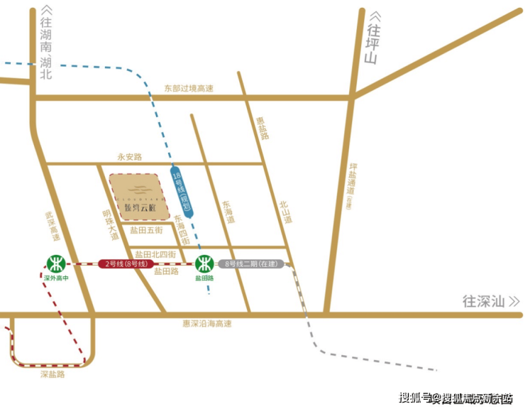 2 号线延长线(8号线一期2020年10月通车)盐田路站直线距离约450米,步行时间约6分钟。