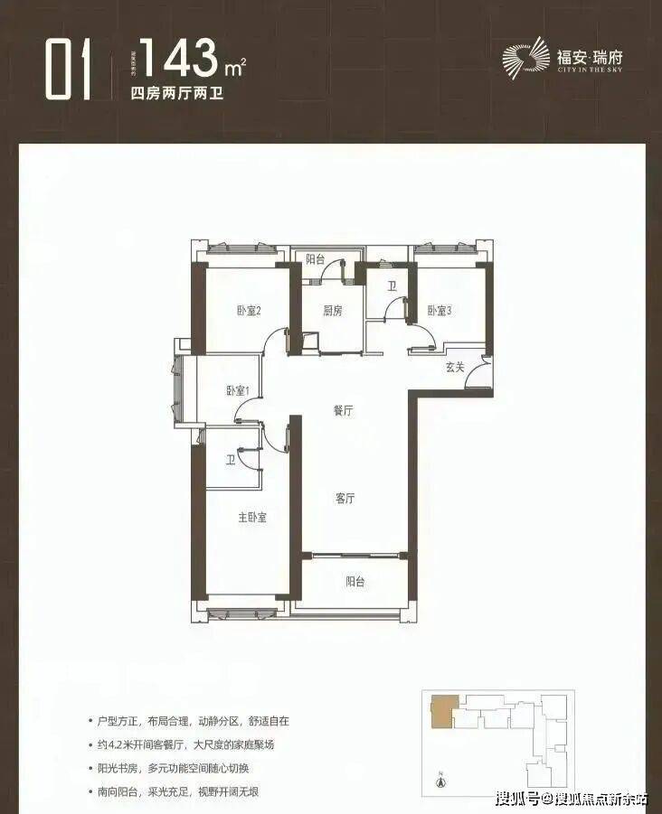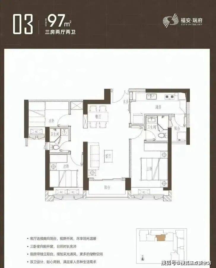 福安瑞府户型图已经公示,主推建面约97-98-112-126-143㎡的3-4房产品。户型均设计有双阳台、双套房。