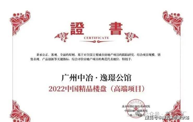 2022年7月7日,中冶 · 逸璟公馆荣获中指院“2022中国精品楼盘TOP1(高端项目)”。