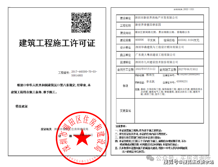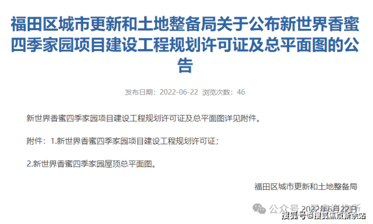 2022年6月22日,福田区城市更新和土地整备局发布关于公布新世界香蜜四季家园项目建设工程规划许可证及总平面图的公告。