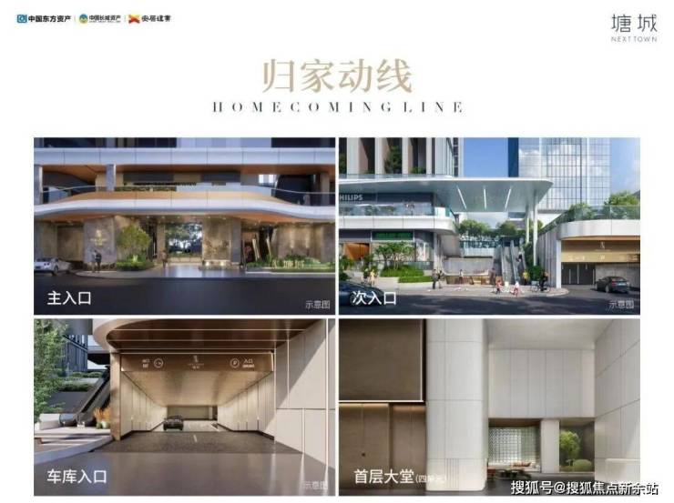 酒店化主入口、次入口、车库入口、首层大堂,酒店化迎宾与归家动线,以无风雨通廊为核,赋予归家更多体验感,带来高效、安心的归家出行之旅。