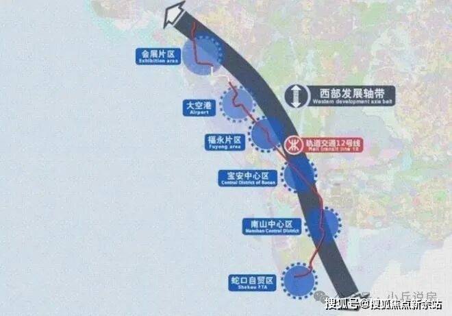 地铁12号线由南向北依次串联蛇口自贸区、南山中心区、前海自贸区、宝安中心区、机场和会展片区,是支撑深圳西部发展轴的轨道交通骨干线。