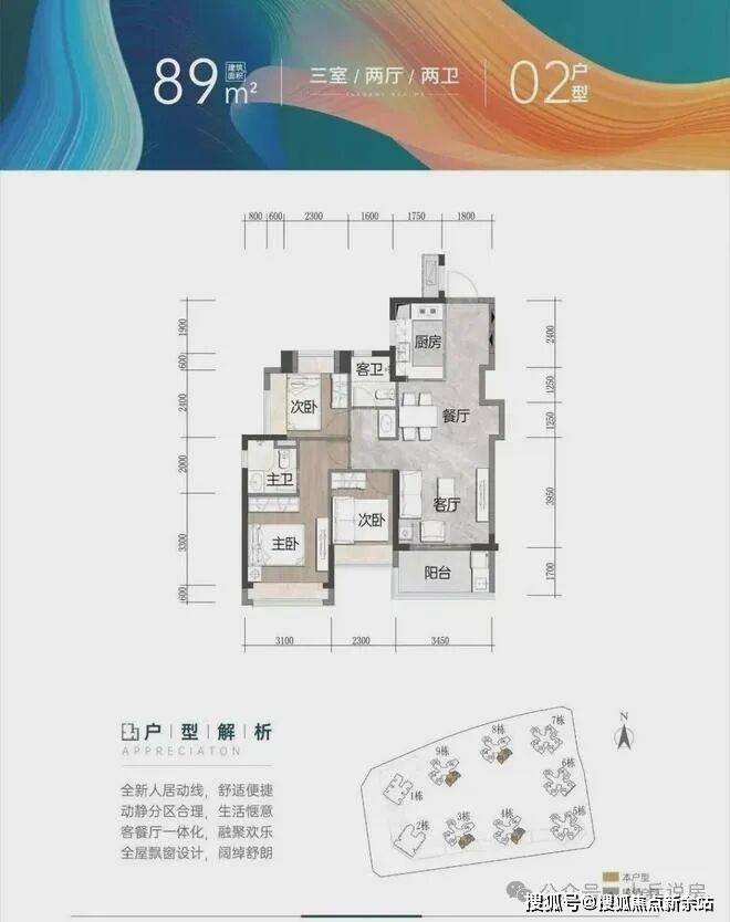 建面约89㎡ 3房2厅2卫(横厅):经典宽阔横厅打造,客餐厅一体化设计,通风采光俱佳,全凸窗设计。