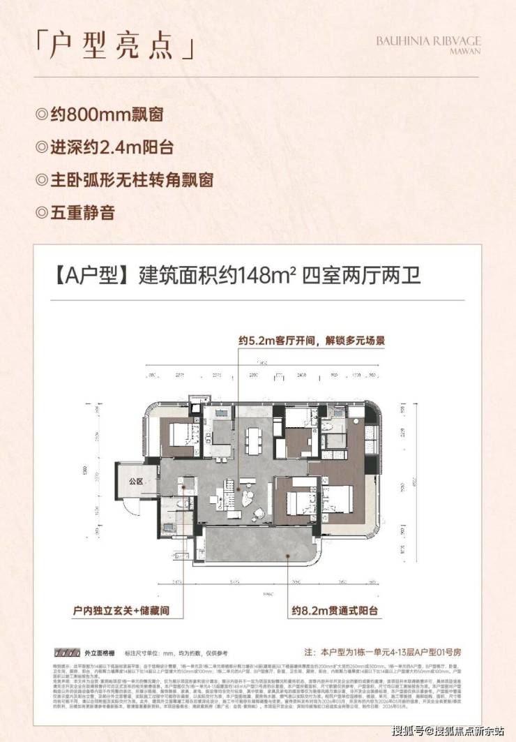 148㎡的4房2厅2卫,设计的是横厅南北通透格局,宽敞入户前门厅,3梯4户,客厅5.22米开间,客餐厅分离化设计,四开间朝南,奢阔主卧,270°无柱转角大飘窗,分别做到了主卧30.5㎡/次卧13.23㎡/次卧10.05㎡/次卧9.64㎡(包含墙体飘窗),U型厨房,公卫三段式干湿分离,得房率约100%(包含赠送),客厅连接次卧出19.74㎡的大阳台,长8.22米,西南或东南朝向。