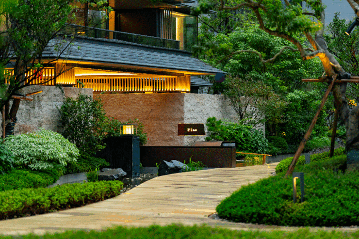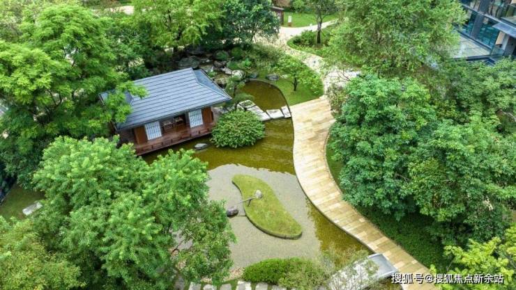 小区园林“四谷三庭”的空间布局,不像传统豪宅园林那样“扁平”,而是非常立体。在这里,项目借助砂、石、水、木等元素,营造山水庭院的禅意。搭配上樱花树等各种花期不同的树木,也算是把“四季”风景搬到小区楼下。
