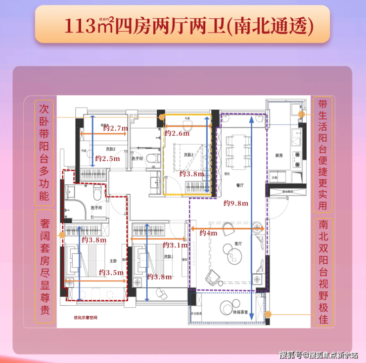 3、户型:建筑面积约113㎡四房两厅两卫,稀缺南北通透,三阳台设计,约4米阔景大阳台