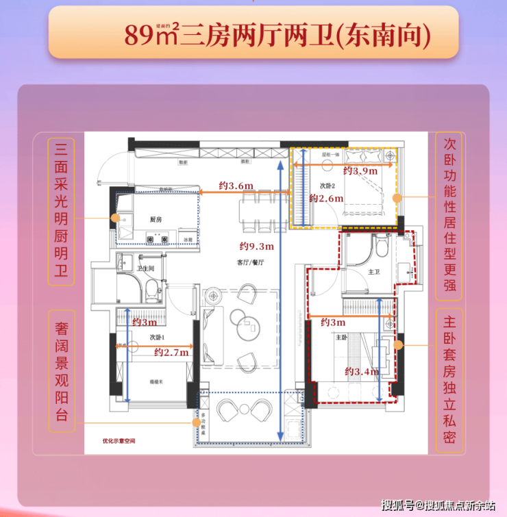 2、户型:建筑面积约89㎡三房两厅两卫,东南朝向,双阳台,主卧套房设计