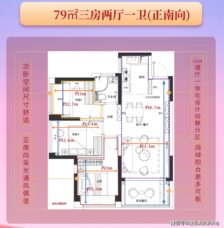 1、户型:建筑面积约78-79㎡极致三房两厅一卫,稀缺高性价比三房