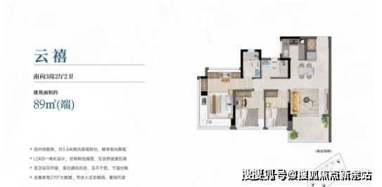 89-92㎡三房户型:该户型是项目的主力户型之一,面积段涵盖89.04㎡、92.31㎡两种规格,布局大致相同,细节略有差异。户型采用三开间南向设计,客厅与主卧、次卧均朝南,采光面充足;餐客厅一体化设计,连接南向阳台,空间通透开阔,适合家庭聚会与日常活动;厨房采用U型布局,操作空间充足,兼顾实用性与便利性;主卧配备独立卫生间,保障业主隐私。