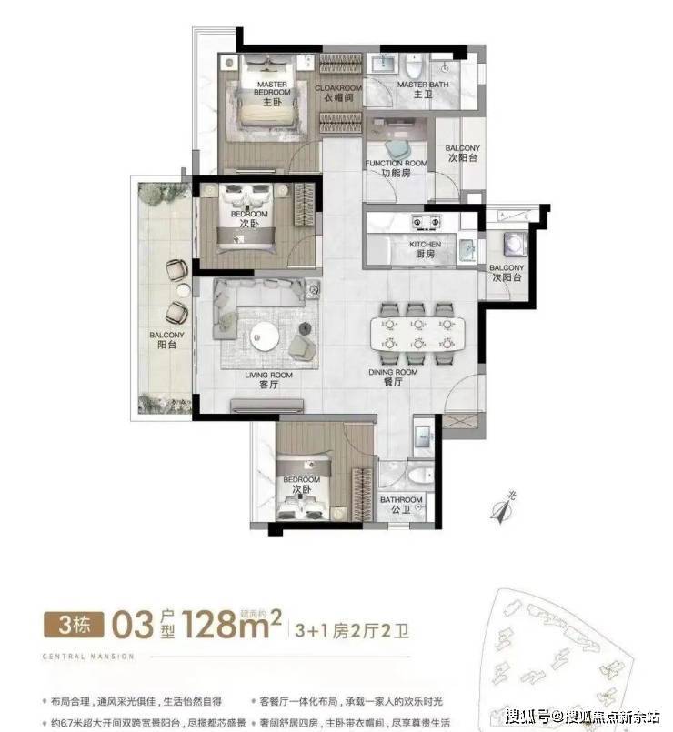 建面约128平方米四房两卫:适合大家庭居住,提供了更加宽敞的空间布局,满足多样化的生活需求。
