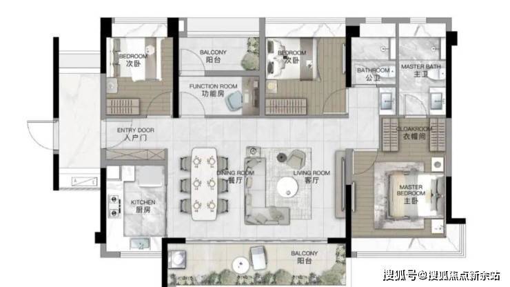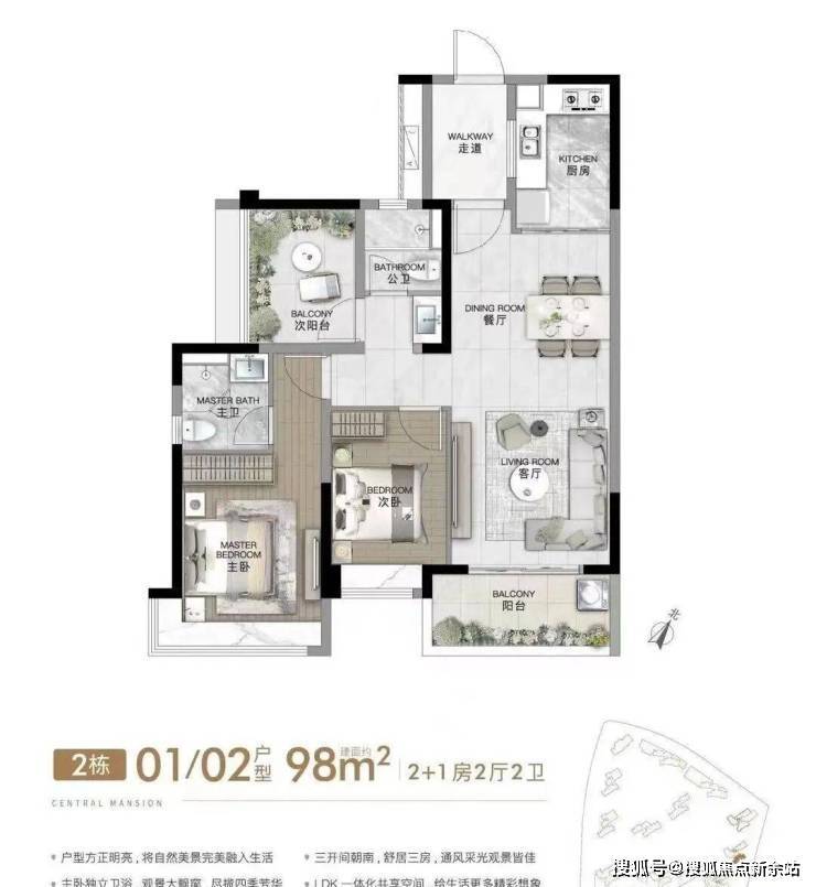 建面约98平方米2+1房:该户型设计紧凑实用,最大的亮点是主卧室带有270度飘窗,增加了居住空间的开阔感。