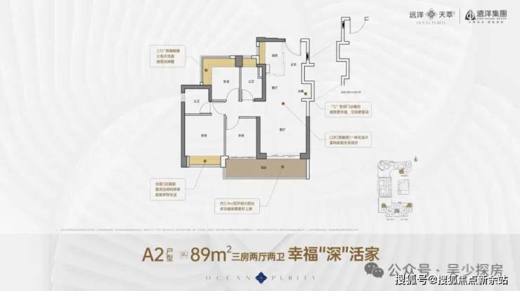 A2户型-约89㎡3房2厅2卫:户型分布在1、2、5单元,阳台南向、东向、西向均有选择。