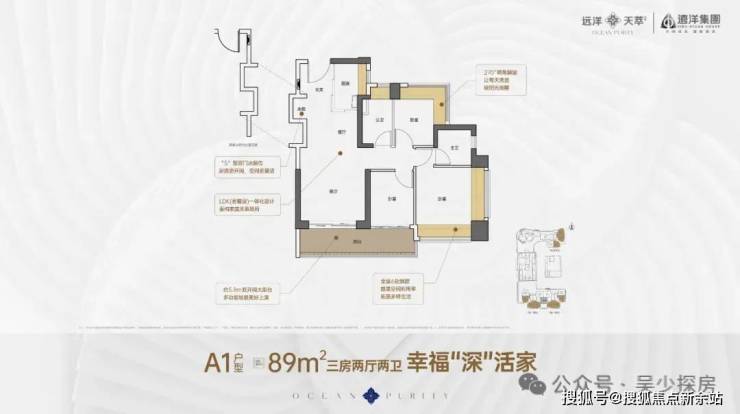 竖厅格局,客厅3.5米开间,LDKB一体化,S墙设计预留冰箱卡槽位,客厅连接次卧出5.9米长的大阳台,次卧270°转角飘窗,对比A1户型少一面飘窗,U型厨房,卫生间干湿分离。