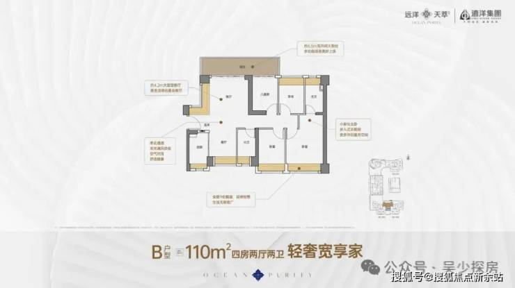 B户型-约110㎡4房2厅2卫:户型分布在1、2单元,竖厅南北通透格局。