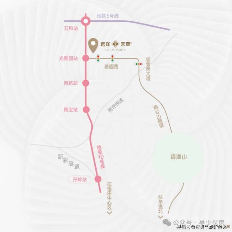 远洋天萃家门口就是“福田专线”——10号地铁线“光雅园站”B出口,1站到五和枢纽站,可换乘5号地铁线/深大城际,3站可到龙华深圳北站,3站到福田、4站到南山。