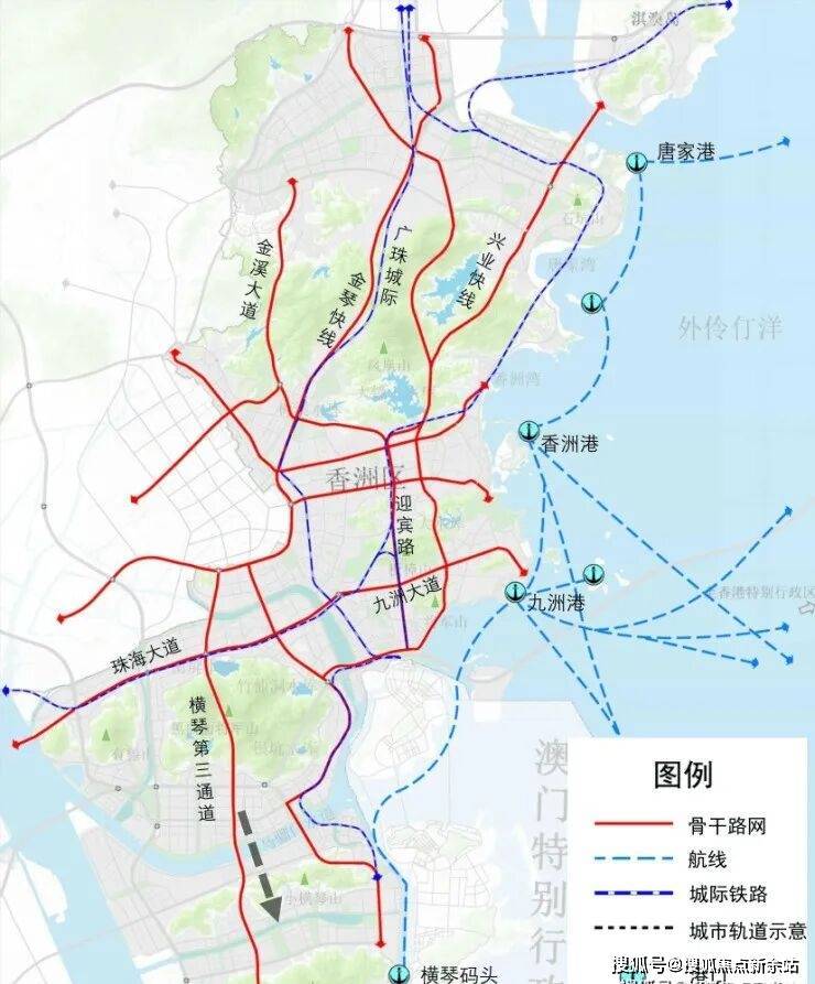 以香洲港、九洲港、唐家港和横琴码头四处路侧码头为锚点,积极引入城际轨道、城市轨道,完善衔接转换的高快速通道、片区微循环路网,优化至海岛的航线,来提升核心城市组团与海洋海岛的衔接效率,积极落实陆岛交通发展战略。