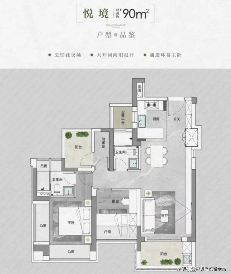 面积与户型:推售房源涵盖建面约90-95-105-143㎡的3-4房,共298套可售房源。其中,95/105㎡三房户型以朝东为主;90㎡三房户型朝西;143㎡四房大户型东南朝向。• 得房率:通过创新性的飘窗、双阳台改造、设备平台赠送等设计,实现平均94-96%的惊人得房率。