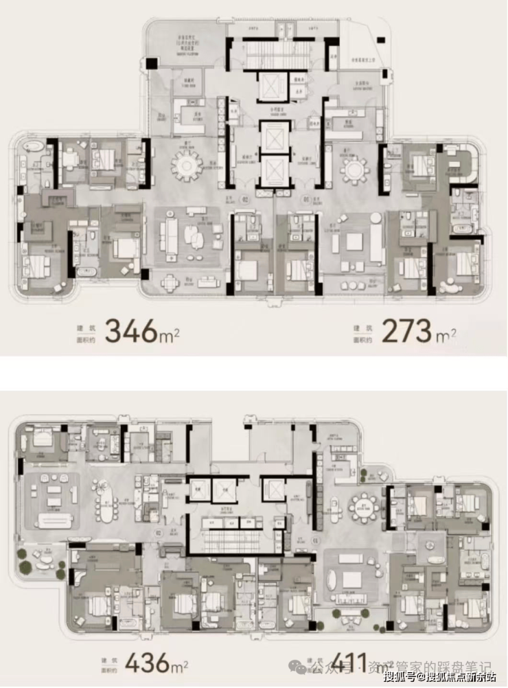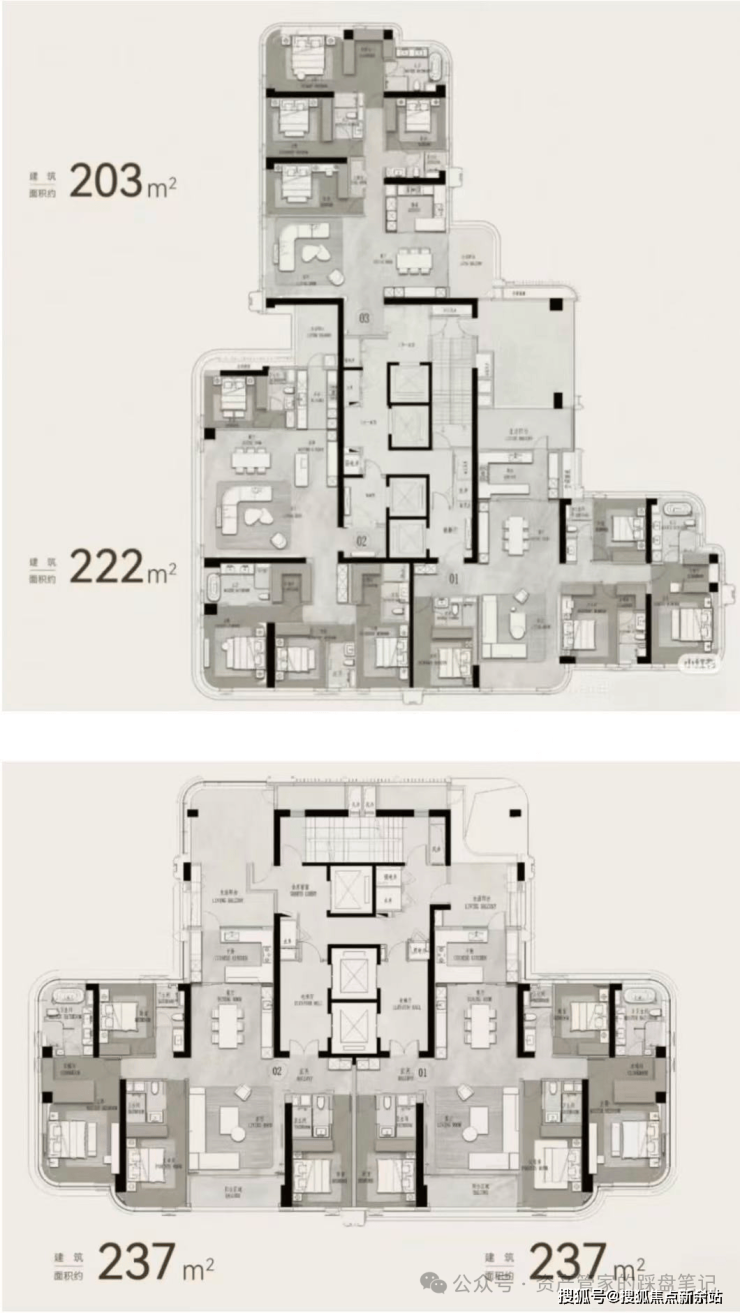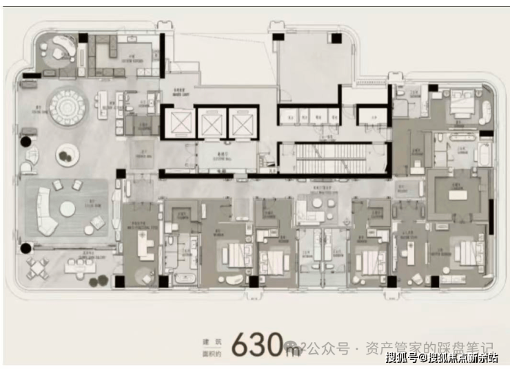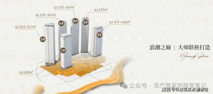 1号楼和9号楼的位置最好, 所以面积最大。其中1号楼是楼王,面积达到630㎡。9号楼的面积次之,在411-436㎡之间。另外,6号楼和8号楼的面积在270-347㎡之间。3号楼面积最小,203-227㎡之间,所以主力户型为237-347㎡