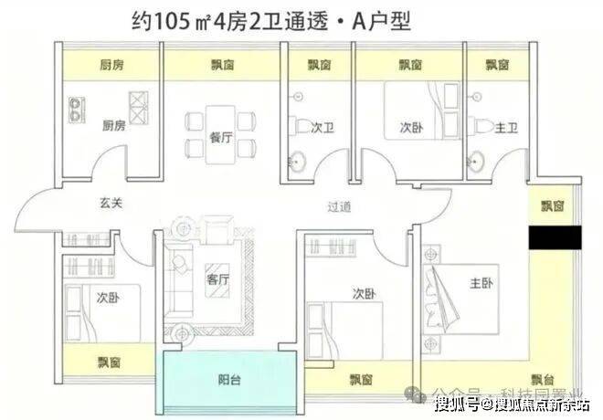 约105-122㎡四房:作为“功能型品质起步”户型,凭借新规下的高实用率(包含赠送得房率约100%)。主卧均带270°环绕式飘窗,户型设计通过飘窗“送了不少面积。
