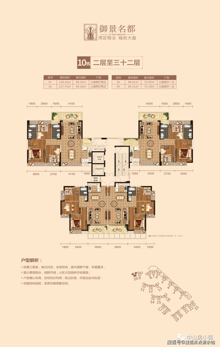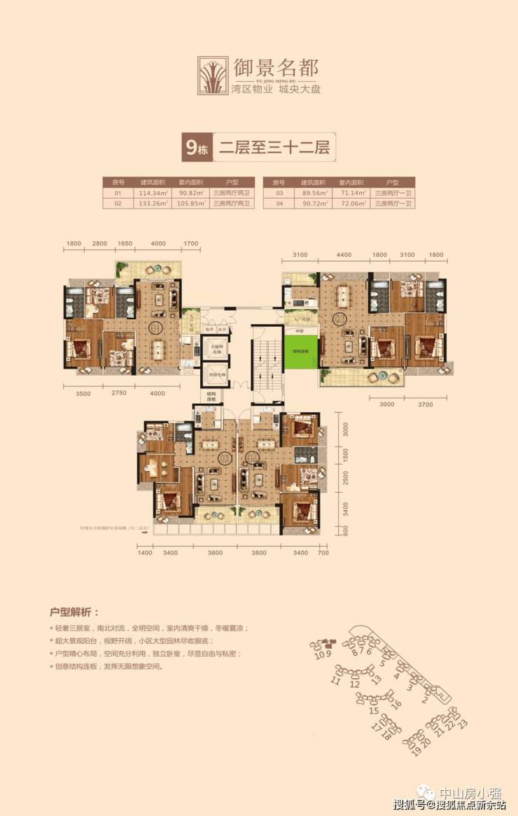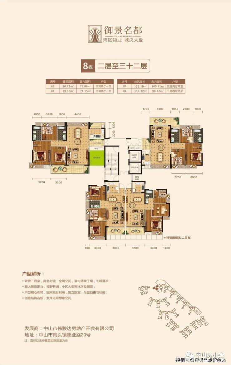 项目占地: 91802.5㎡,总建筑面积: 395211.92㎡,湾区物业.城央大盘 60000㎡生态园林,容积率3.5,绿化率35%,小区规划有23栋最高32层,约2448户,户型面积:89㎡-132㎡的电梯洋房,一层四户,南北对流,超宽楼距,包含1栋酒店式公寓,局部1~4层临街商铺;中山市伟骏达房地产开发有限公司