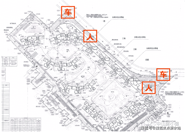 项目规划有两个主出入口,销售中心旁侧和公寓式酒店旁边,可供行人通行;有 四个独立的车库 出入口,仅供车辆通行。见图