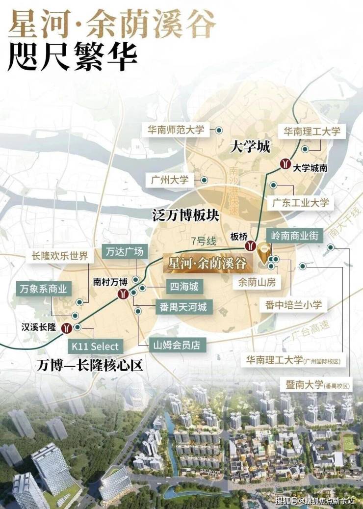 余萌溪谷距离7号线很近,实测距离地铁站503米,2站到万博,1站大学城,5站到琶洲,6站珠江新城。
