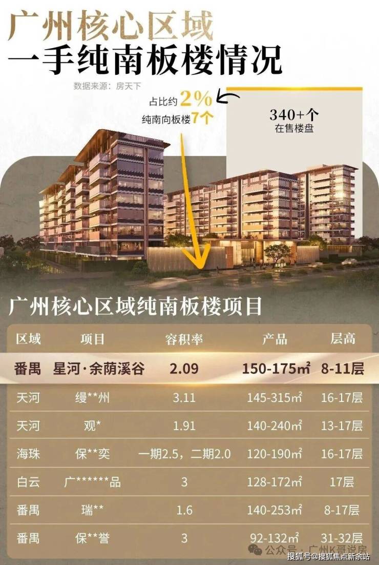 根据不完全统计,广州核心区域在售盘340多个,做到纯南向板楼的不到10个,占比仅约2%。