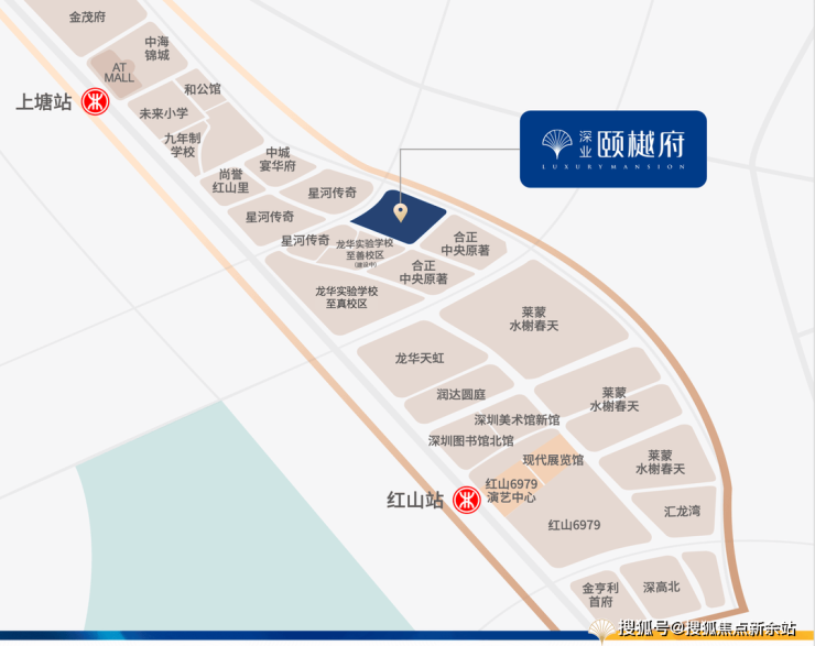 深业颐樾府地处深圳市龙华区民治街道民塘路与上塘路交汇处,隶属于龙华红山-上塘核心居住区,这一板块被誉为龙华的“颜值担当”与“生活担当”,是龙华最早规划的高品质居住区,也是目前龙华居住氛围最纯粹、城市界面最新、配套最成熟的板块之一[4]。作为深圳都市核心区规划的重要组成部分,这里承接北站总部经济与文体配套红利,长期价值清晰可见