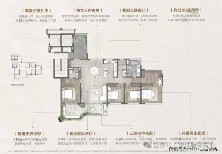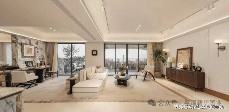 以约44㎡无界宽厅划写天际线,约19.5米环幕视界打破空间桎梏。奢适主卧套间三面环景,270°环幕飘窗私藏四时光影,以约139㎡空间容器承载约200㎡奢居想象。