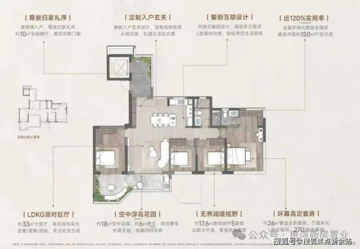 而「岛颂」以市场首现的约120%实用率(不含电梯前室),让约117㎡实际使用面积直逼约150㎡——相当于“白送”约33㎡。