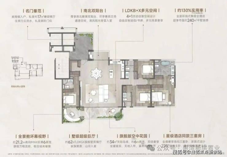 而「岛颂」以LDKGX一体化设计,将约33㎡派对式客餐厅、X多元空间与约18㎡类墅空中浮岛无界串联,形成超50㎡无界空间,煎牛排的香气飘向茶叙的宾客,孩子的拼图游戏与父母的聚会在同一个场域流动。