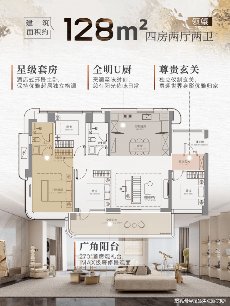 以建面约128㎡户型为例,项目用最小面积内实现了东南向、南北对流的改善型四房,让每一空间都物尽其用。
