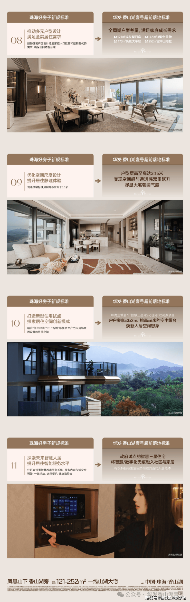 先聚焦到项目本身,华发·香山湖壹号的核心底气,源于其遵循城市“好房子”迭新标准,打造智慧三星标准、「四化」理念与生态属性融合的高奢住宅作品。