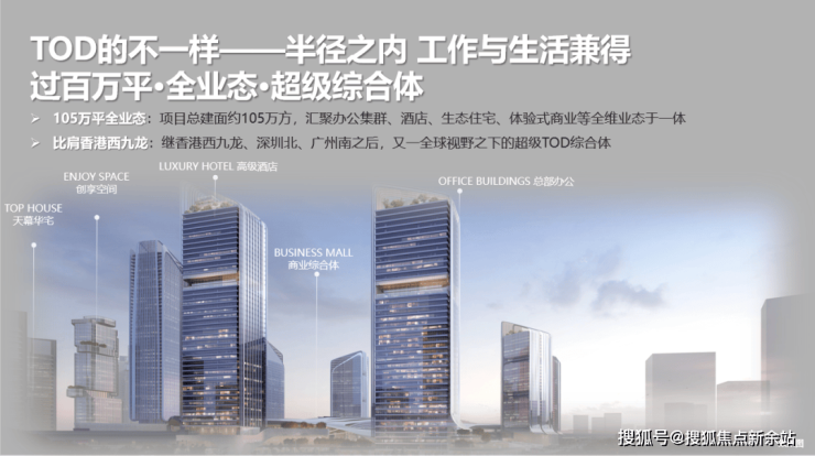 105万㎡全业态综合体:集写字楼群、创享空间、酒店、住宅、商业、轨道交通全业态综合体融于一体,一站式办公居住吃喝玩乐购”的生活方式;