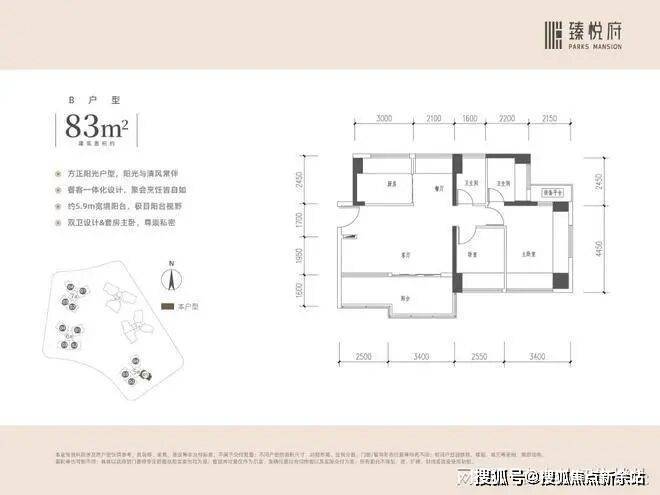 建面约83㎡ 3房2卫:刚需主力户型,适配三口之家居住,户型方正,空间利用率高,无浪费面积。采用新规多飘窗设计,拓展空间充足,得房率优于同区域同面积段产品;主卧带独立卫生间,保障业主隐私,次卧及书房空间适中,可根据需求灵活改造为儿童房、储物间等;客餐厅相连,衔接景观阳台,采光通风俱佳,满足日常起居及简单会客需求。