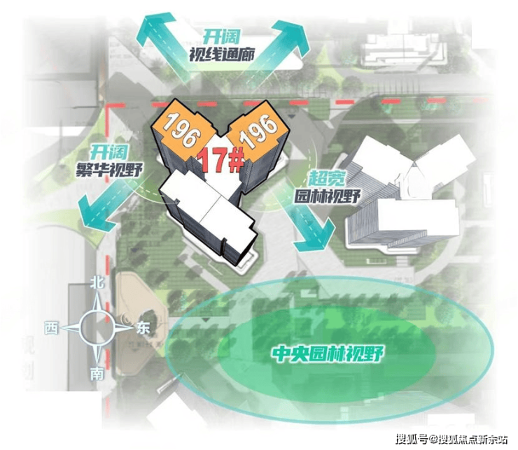 琶洲南二期围合式布局打造,8栋低密小高层,全南向排布。17#坐北朝南,3梯4户设计;