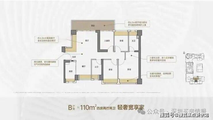 110㎡的4房2厅2卫,设计的是竖厅南北通透格局,客厅4.2米开间,进门户玄关,客厅连接次卧出6.5米长的大阳台,主卧大套间设计,全屋9处飘窗,U型厨房,卫生间干湿分离,阳台主朝北向。