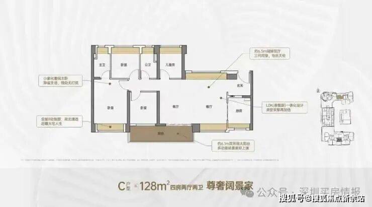 128㎡的4房2厅2卫,设计的是横厅南北通透格局,客餐厅6.5米开间,进门户玄关,LDKB一体化,客厅连接次卧出6.1米长的大阳台,主卧大套间设计,全屋8处飘窗,U型厨房,卫生间干湿分离,阳台主朝南向。