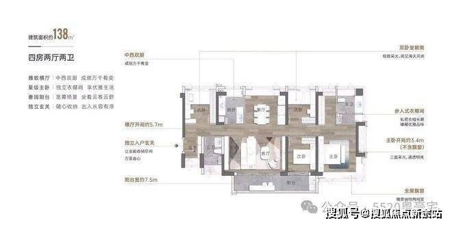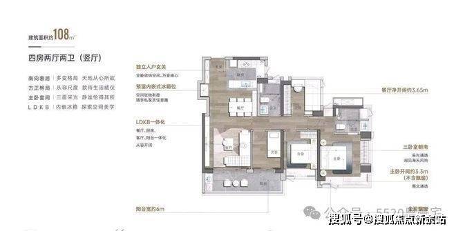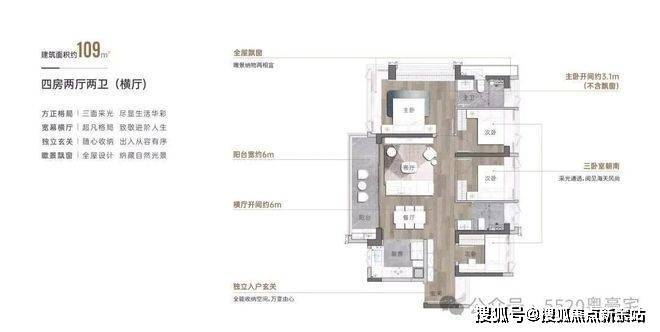 3.7M客厅开间,外加6M景观大阳台,主卧采用大面积飘窗设计,跟越秀瑞樾府高度相似。