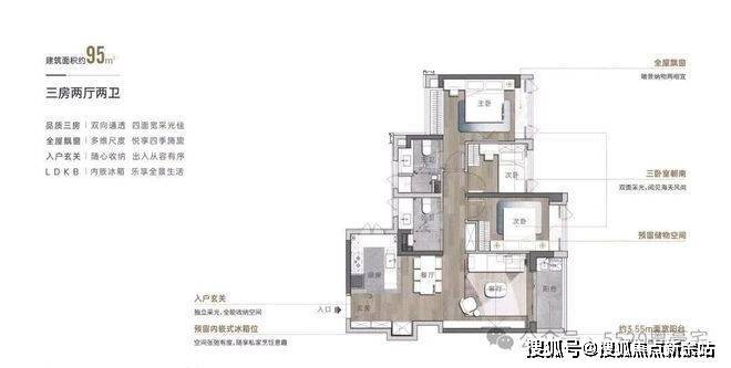 大阳台,餐客厅一体化,玄关进来不对着客厅和主卧门,优化了横厅风水对冲问题,无论是横厅还是竖厅得房率都做到了82%,综合使用率高达89%。