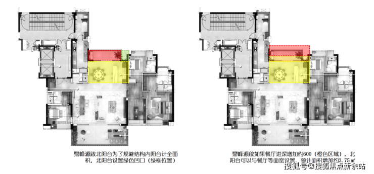 不过,鼎峰源啟在北阳台设计上有个小问题。假如北阳台再往外一点(看图大约是600㎜),就不用设置这个凹口(绿色框范围),立面更完整,可以做到北阳台和餐厅等宽,未来拓展性更好。也可以解决目前餐厅实际进深较浅的问题。
