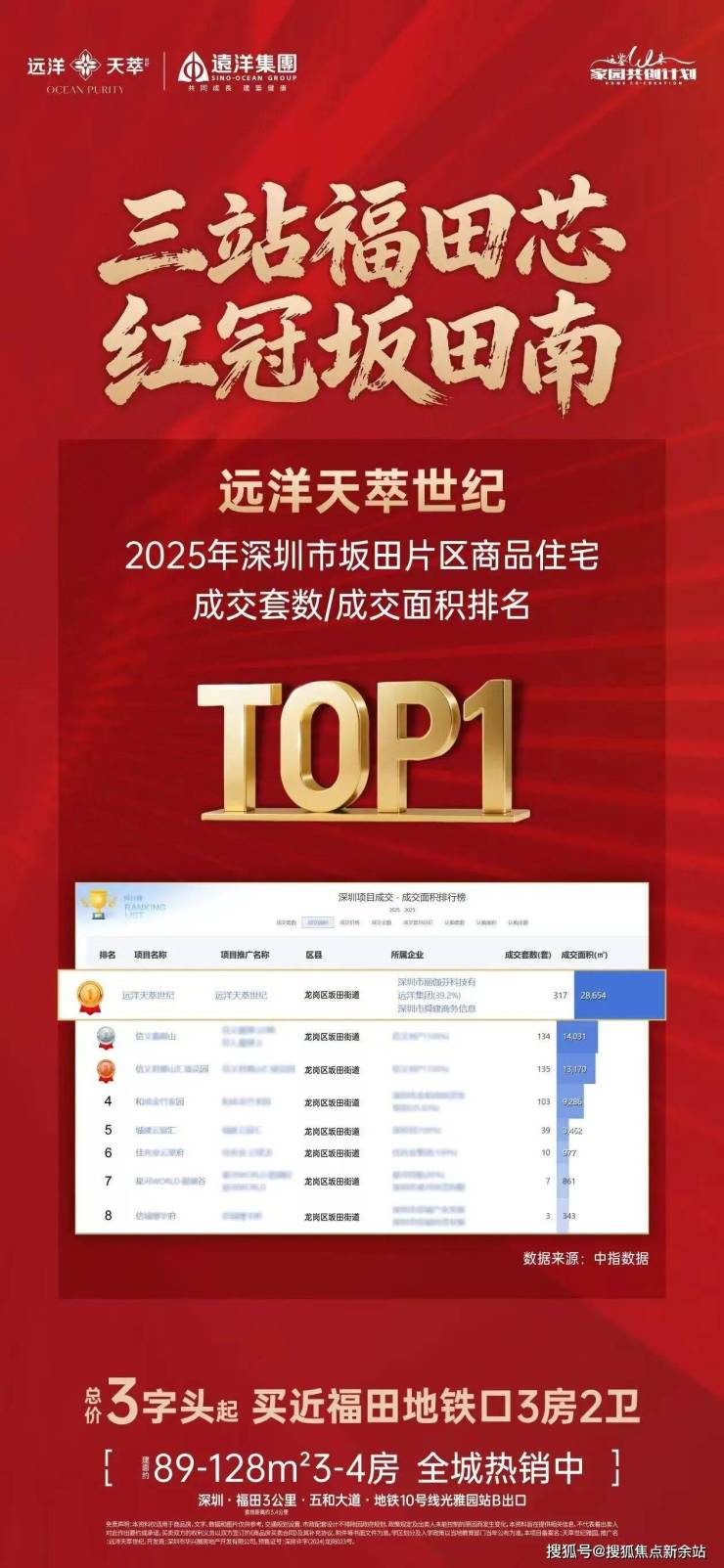 《远洋天萃世纪雅园》位于龙岗坂田,五和大道与光雅园路交汇处东北侧,紧邻地铁 10 号线“光雅园站” B 出口。占地 1.36 万㎡,总建筑面积约 15.89 万㎡,规划有 4 栋 41-47 层的住宅、1 栋 34 层写字楼,及 1 所幼儿园,共795户,694个车位,1:0.87,。其中商品房615 套,人才房180套,预计 2026 年 12 月精装交付,(含华为智能精装)。