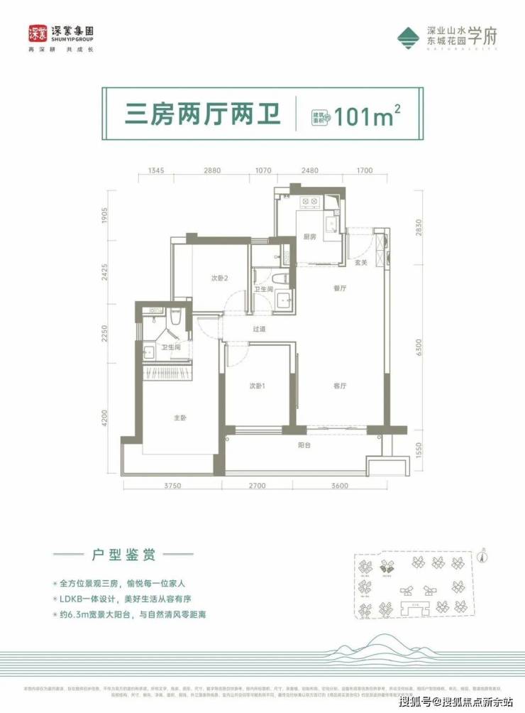 101㎡的3房2厅2卫,设计的是经典竖厅格局,进门入户玄关,客厅3.6米开间,LDKB一体化设计,三开间朝南,3个卧室分别做到了3.75米/2.7米/2.42米的宽度,客厅连接次卧出6.3米的大阳台,U型厨房,卫生间干湿分离,得房率:75%(不含赠送),西南或东南朝向。