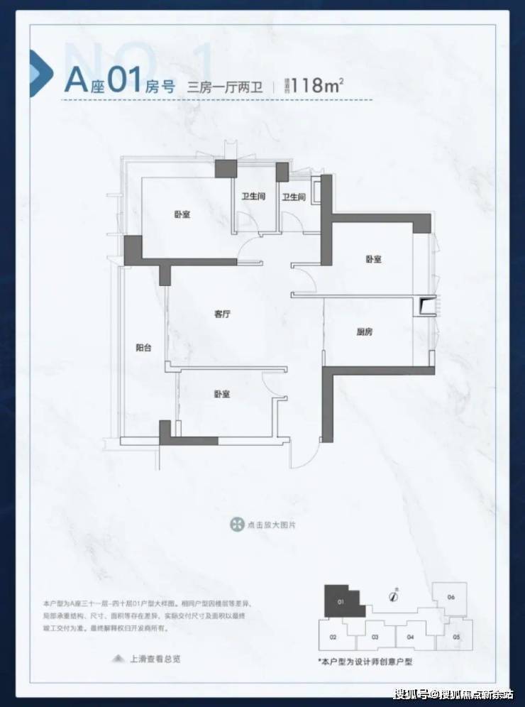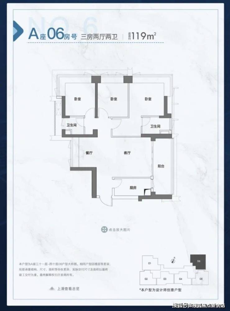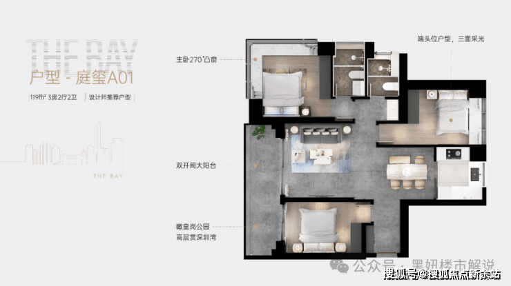 119㎡三房两厅两卫:户型方正实用,动静分区合理,南北通透,采光性能优秀,主卧套房设计,保障私密性,适合三口之家或改善型需求。