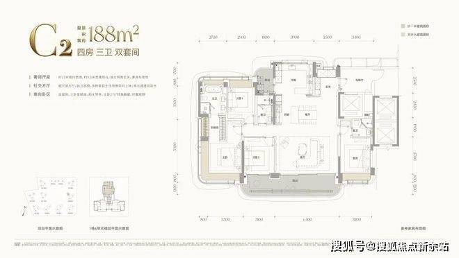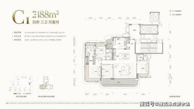188㎡户型都是通透设计,均位于1-6栋,在小区东侧,T3品字形结构。基于楼栋结构分了两种户型(C1/C2),总体都非常相似。该户型有点像245㎡的简致版本,同样地客厅有充足的开间可以增设多功能空间,餐厅也有西厨的位置。