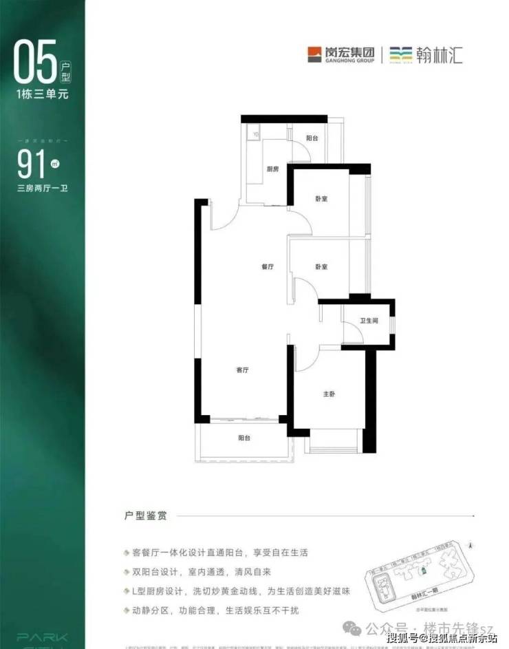 91㎡的3房2厅1卫,设计的是竖厅格局,客厅3.4米开间,LDKB一体化设计,L型厨房还带1个小生活阳台,卫生间三段式分离,得房率约71%(不含赠送),西南或东南朝向。