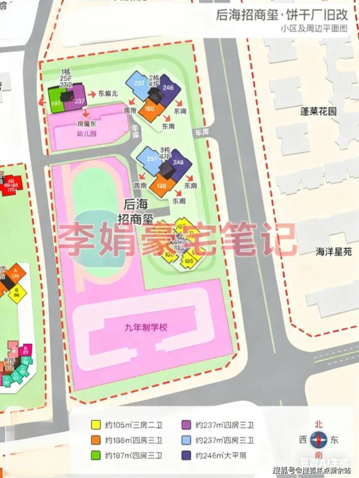 「后海招商玺」占地约1.5万㎡,规划261套住宅,纯大户社区。今年首开1栋高层,推出42套197-237㎡四房大平层,采用通透板楼设计,视野无遮挡。