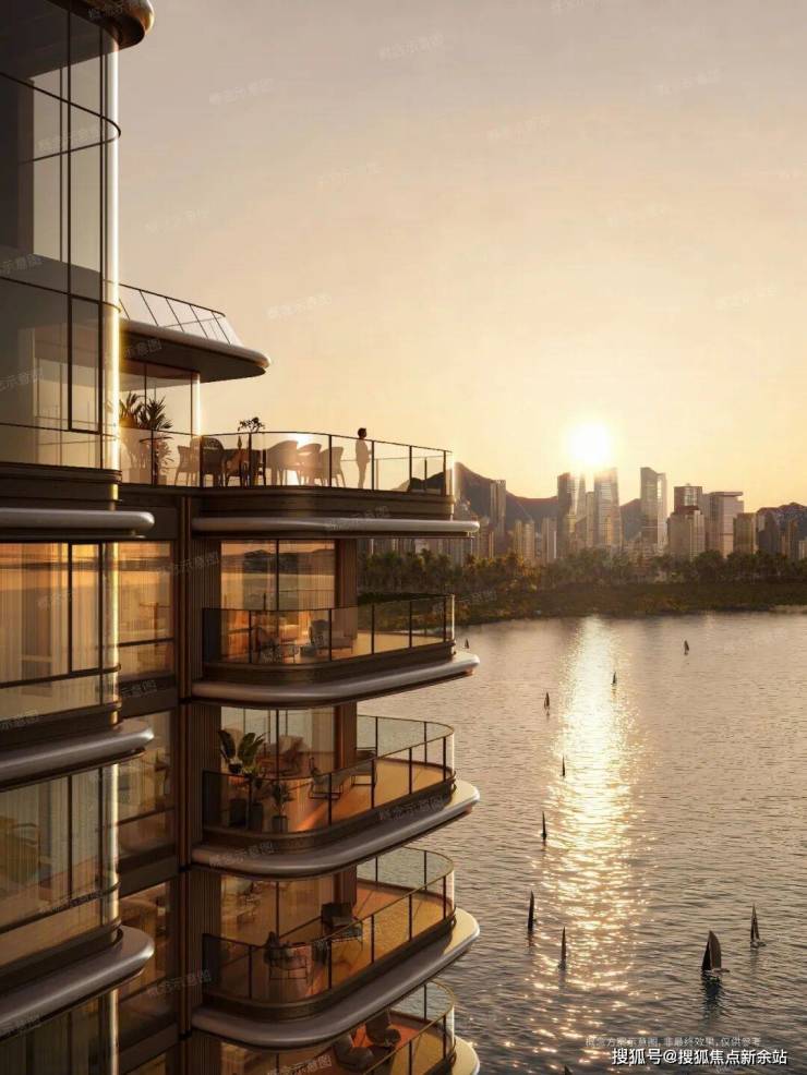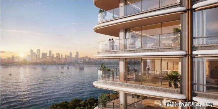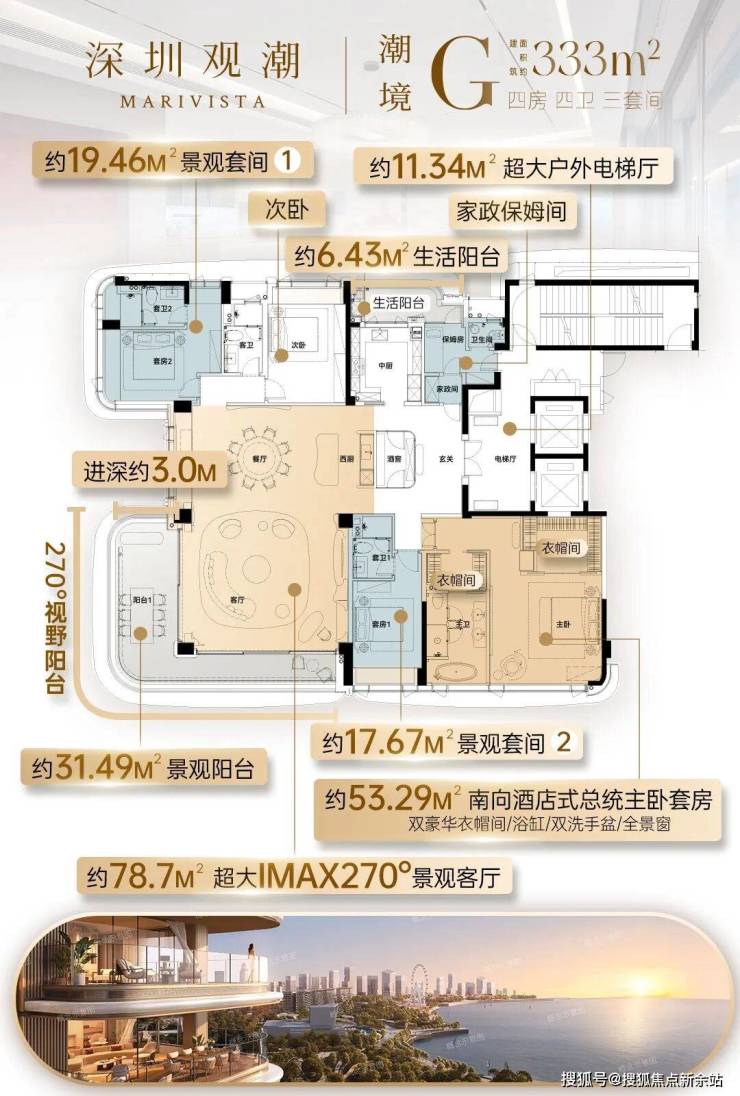 户外电梯入户,环幕360°全景舱布局,南向面宽约21.4米,弧形双阳台拥有270°视野,最宽进深约3米。
